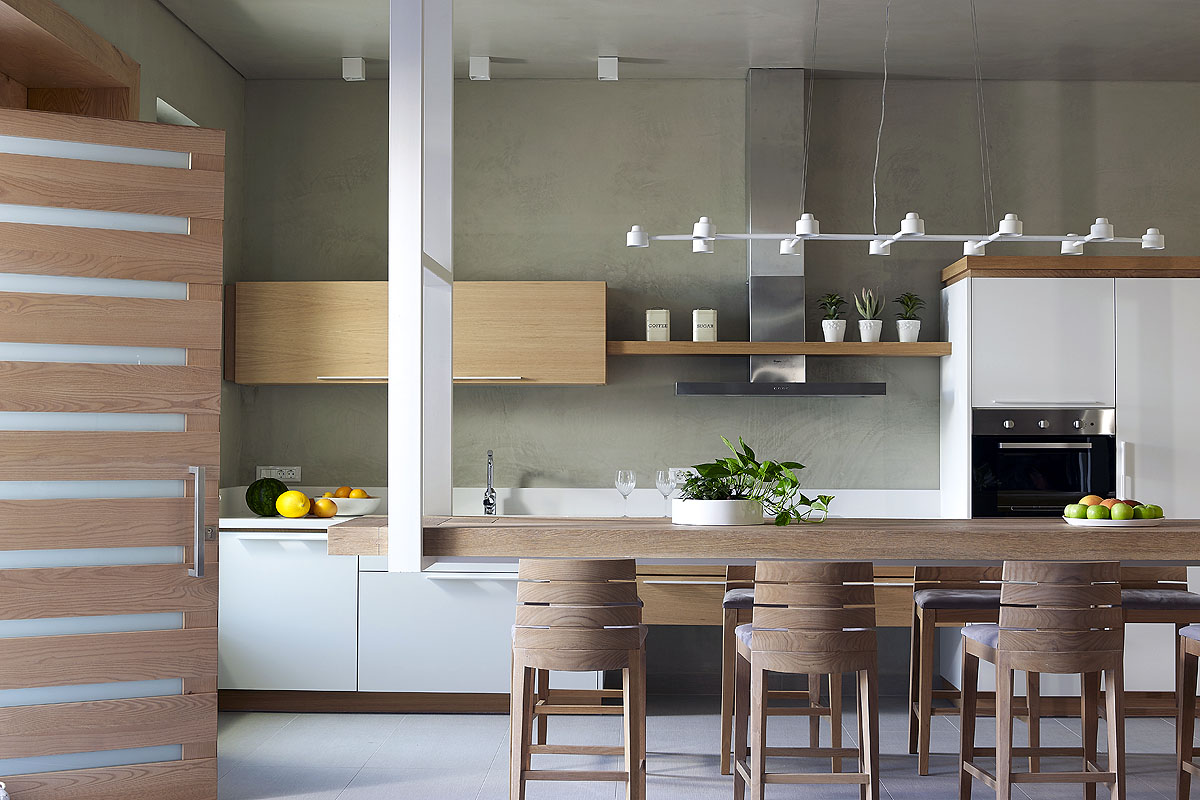 There are two open plan kitchens each with its own living area and a large dining table on the ground floor level.