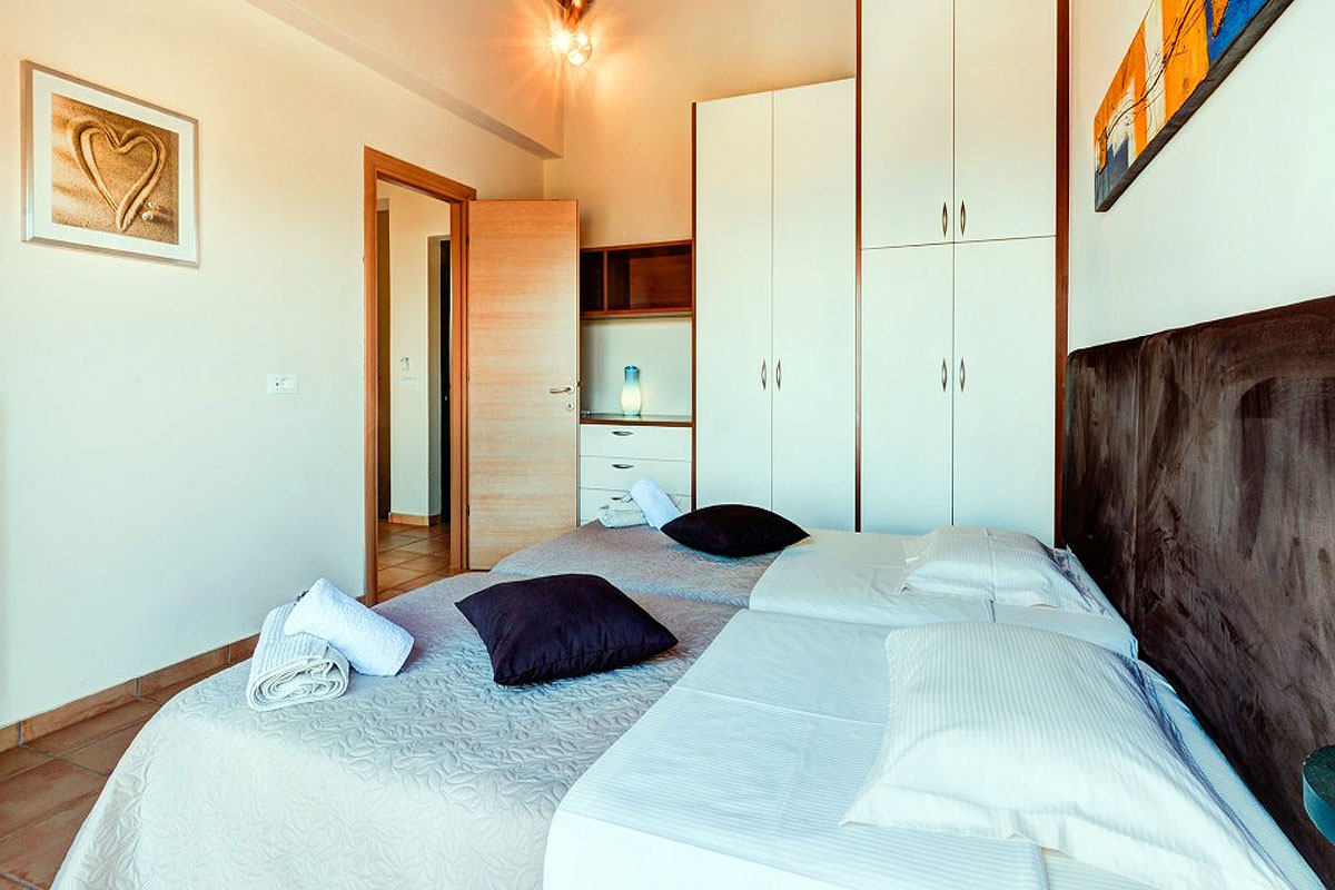 On the ground floor, by the entrance, is a double bedroom Patio doors from both rooms open onto a covered sea-facing balcony. The twin bedroom, on the pool level, also has patio doors opening onto the terrace. A shared bathroom is also available on this level.