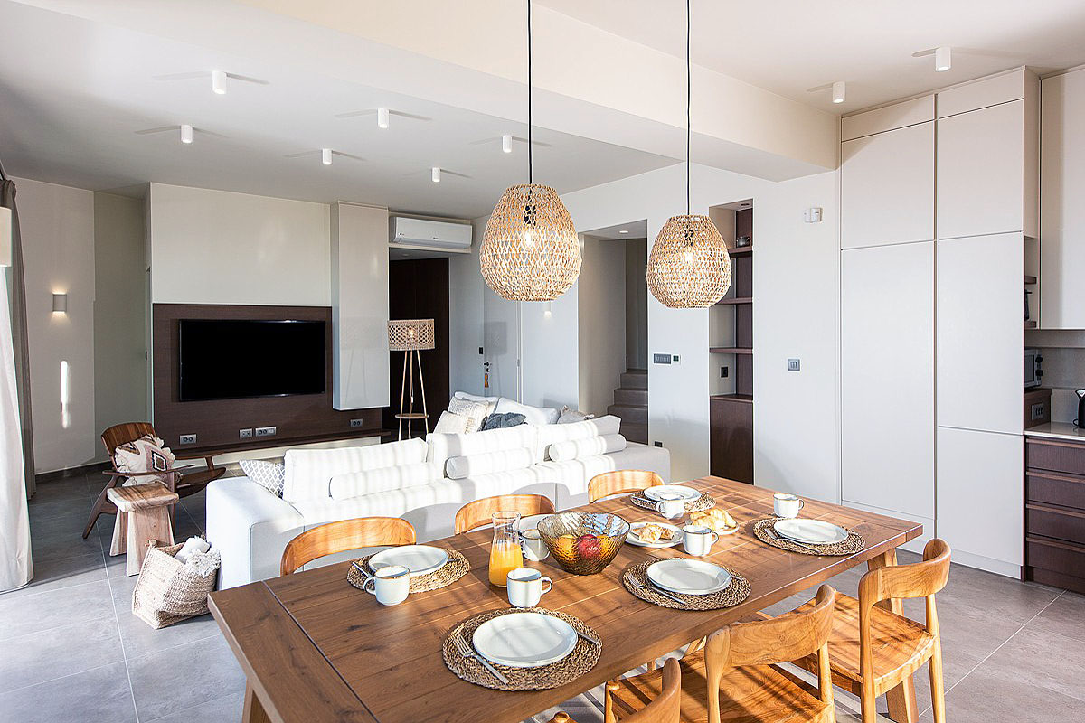 spacious open-plan kitchen, dining, and lounge area inside the villa.