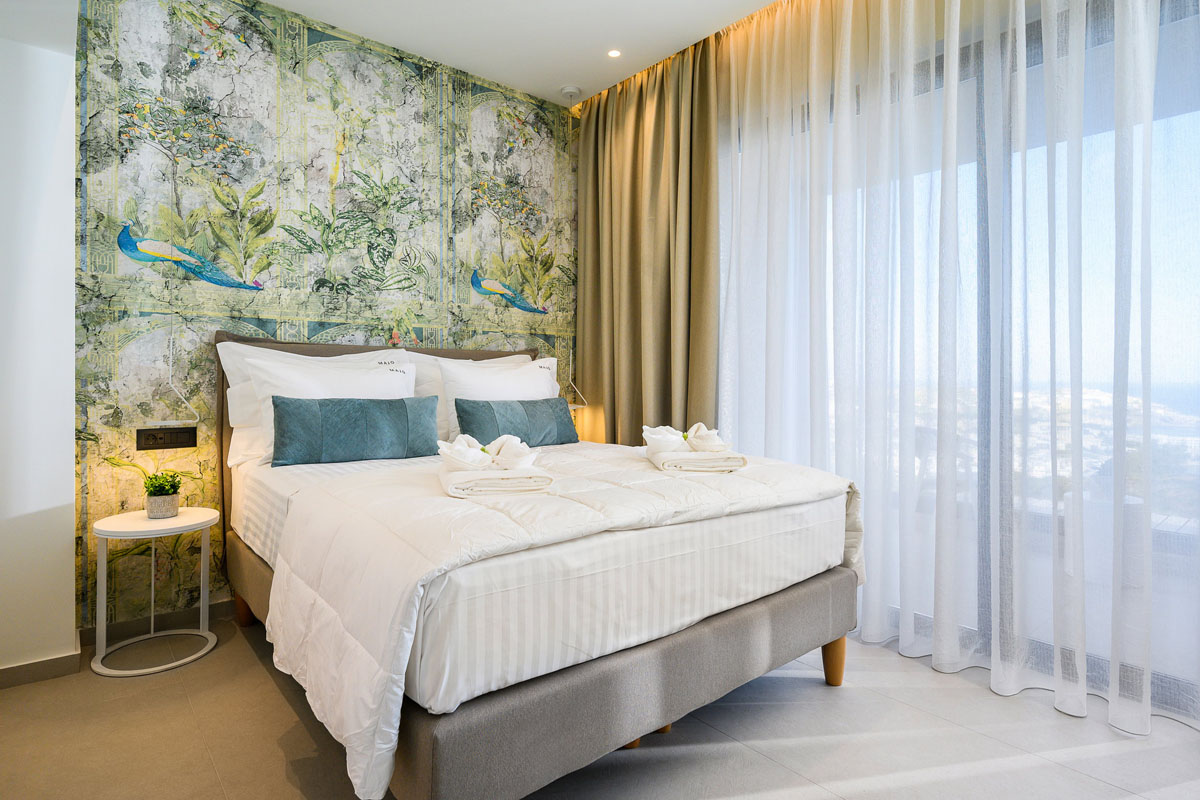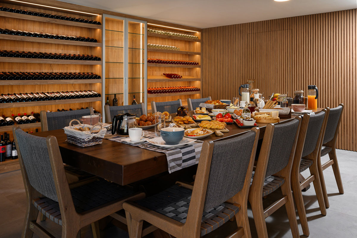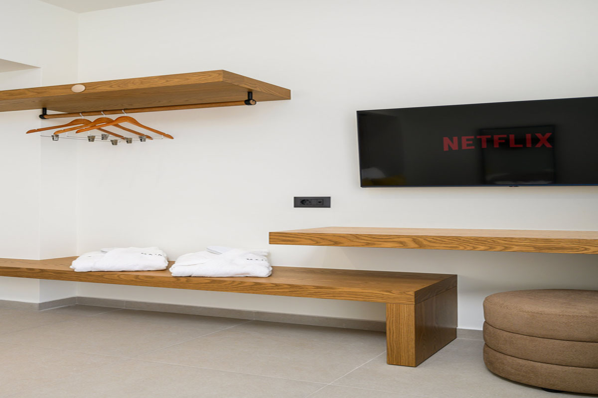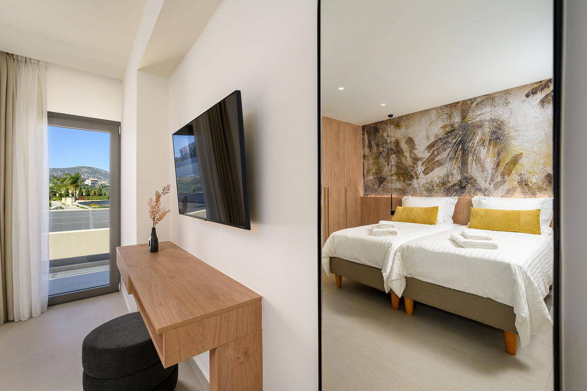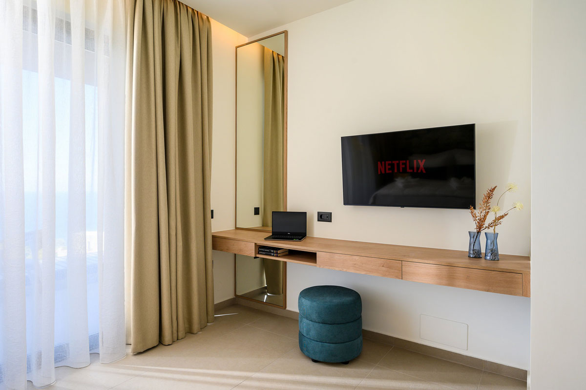 All rooms include ensuite bathrooms, smart TVs, air conditioning, Wi-Fi, and plush bedding. An elevator and stair lift ensure accessibility for guests with special needs. Guests are welcome to enjoy our beautifully designed shared dining area and wine cellar, where breakfast is served daily upon request (extra charge) a refined space that combines Cretan flavors, fine wines, and elegant atmosphere.
