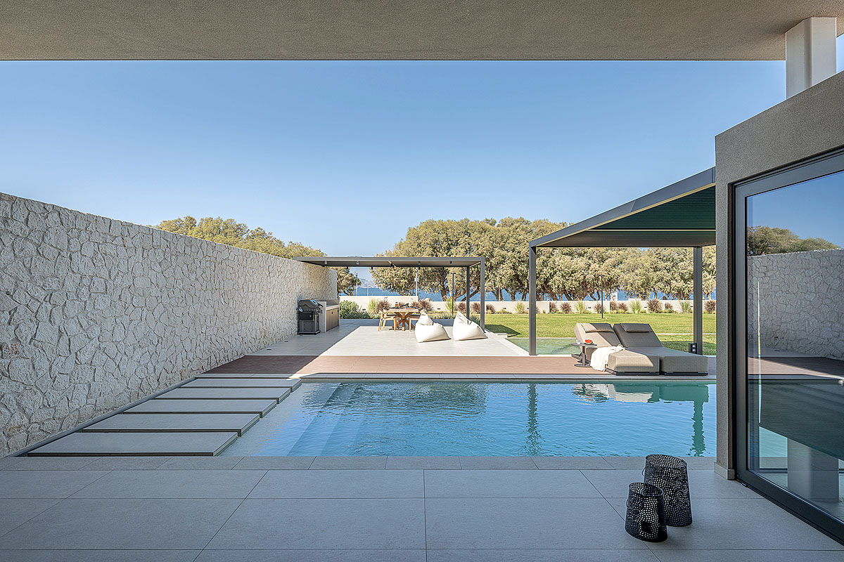 The exterior offers a lush green landscape with sea views. It has an 76sqm heated swimming pool, even providing the possibility for young guests to swim safely. In the pool you will find sunbeds, pool umbrellas, outdoor shower and WC. There is even a barbecue area with an outdoor dining area for up to 10 people.