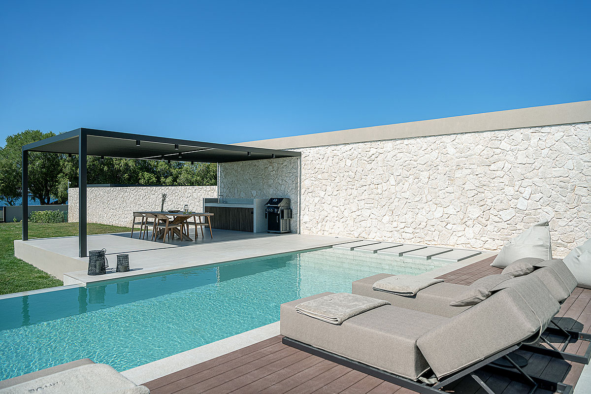The outdoor area offers a green landscape with sea view. It has an 76sqm heated swimming pool, providing even the possibility for young guests to swim safely. In the pool you will find sunbeds, pool umbrellas and an outdoor shower . There is even a barbecue area with an outdoor dining area for up to 10 people.