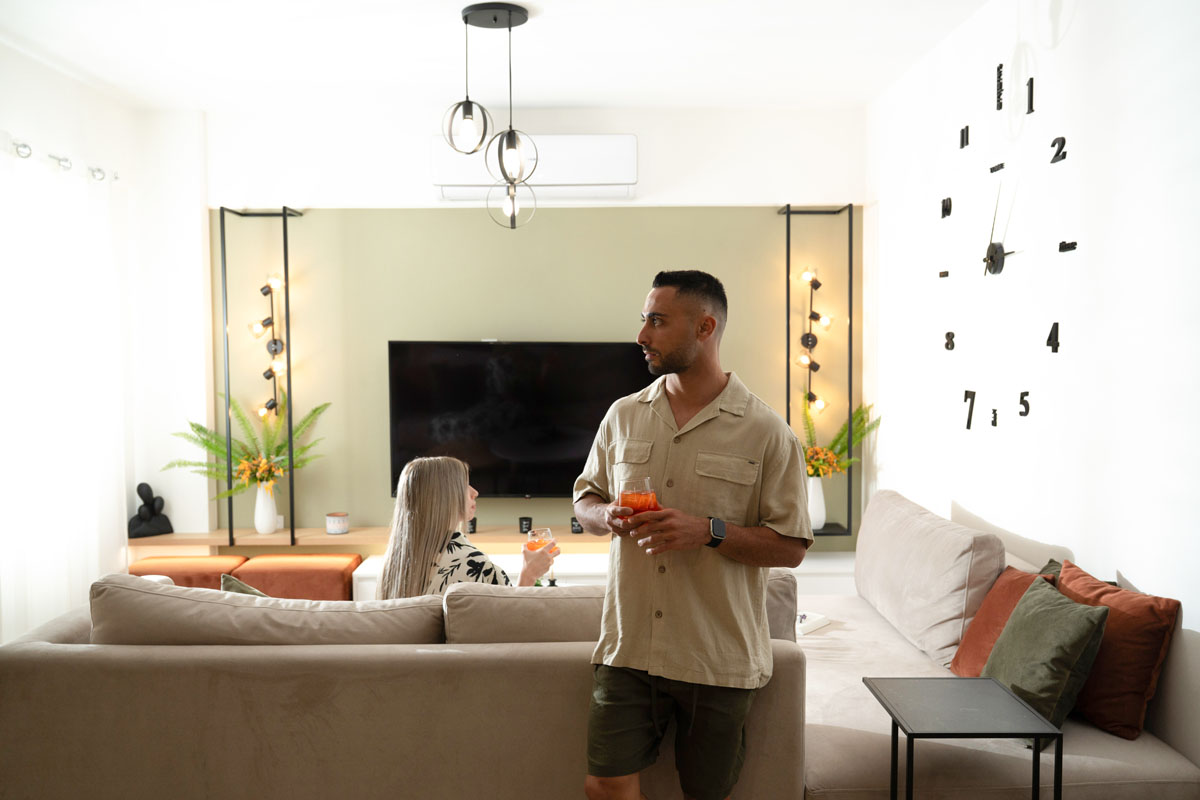 The apartment features three bedrooms: two with double beds that can be converted into two single beds in each room, and a third bedroom with a single bed. There’s also a sofa bed in the living room, bringing the total capacity to six guests. You’ll find a fully equipped kitchen for home-cooked meals, two modern bathrooms, and a bright, stylish living room that invites you to unwind after a day of exploring.