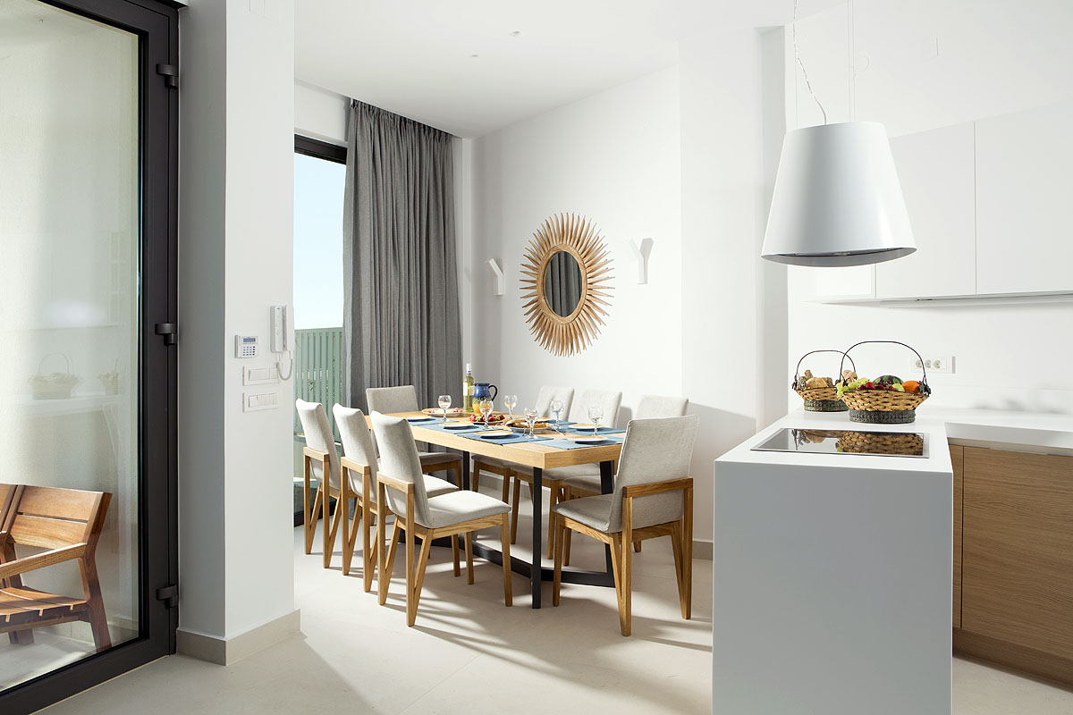 living space, a fully equipped kitchen with a dining area for 8 people, a