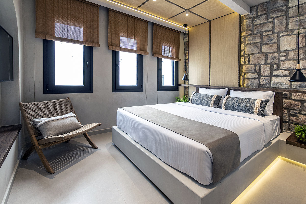 Offering a wonderfully-appointed interior, our Breeze Suite with Outdoor Hot Tub offers breath-taking views and endless comfort, nestled within the lush nature of the Sand Suites. Give yourself a moment of relaxation, forget your routine and simply let go within its premises. Natural materials like stone and wood, eclectic pieces of furniture and art, a palette of muted greys and beiges, and a bohemian feel throughout, all combine to make your suite a uniquely compelling place to be. They feature a bedroom with a queen bed, a luxurious bathroom, a balcony and an outdoor Hot Tub overlooking the beautiful sea.