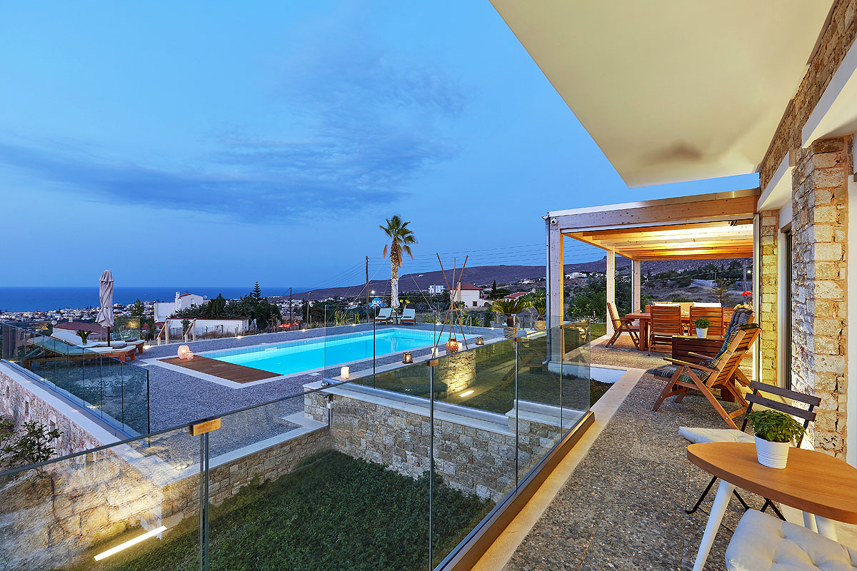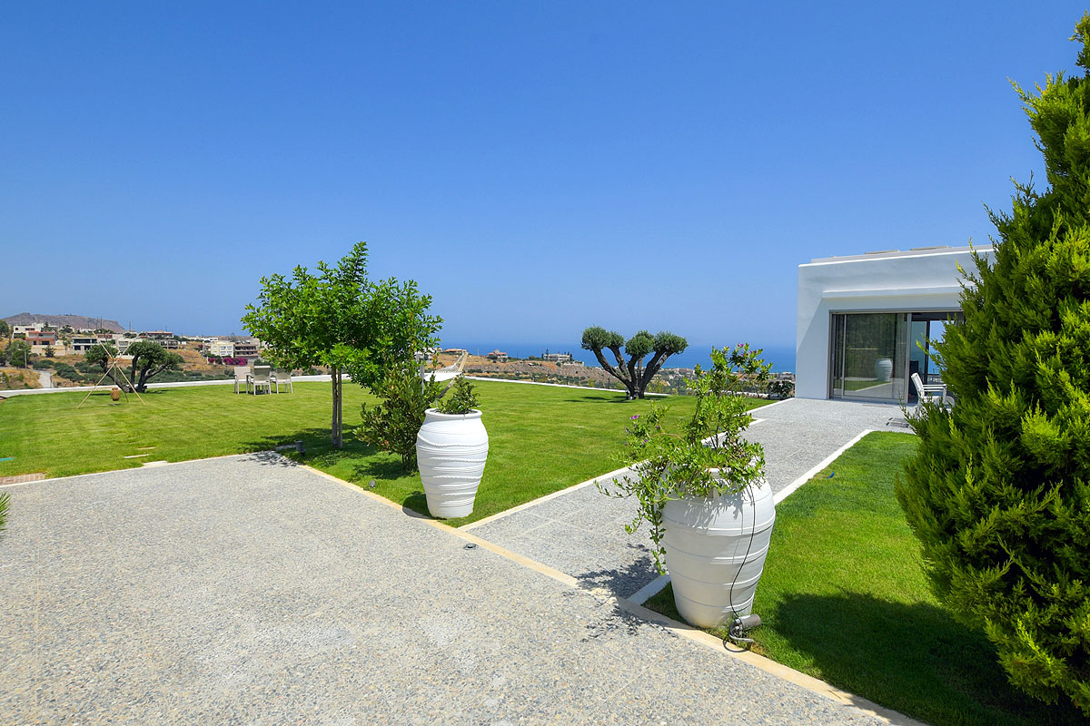 The villa is built on a 3.500sqm plot on a hillside and offers beautiful views of the Sea. Outside the main living area is a huge terrace with a 50sqm private heated pool with a lawn garden, modern comfy sun loungers, a shaded dining area and a BBQ spot.