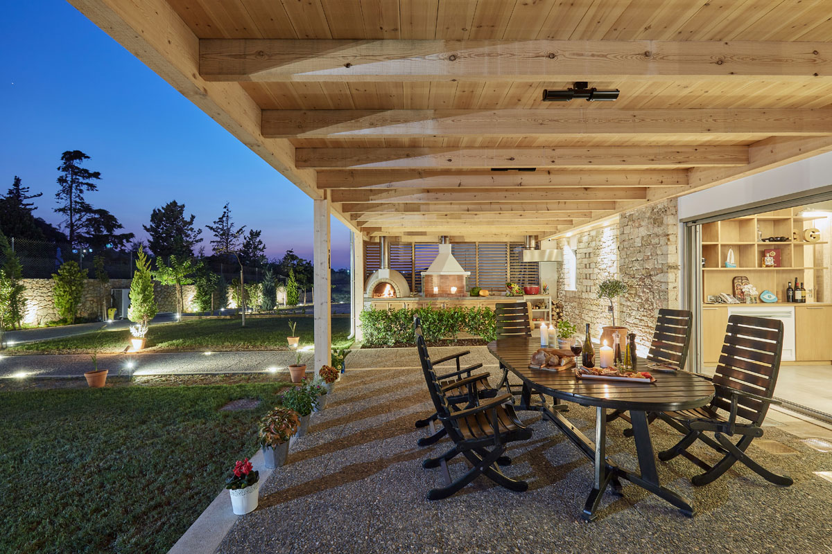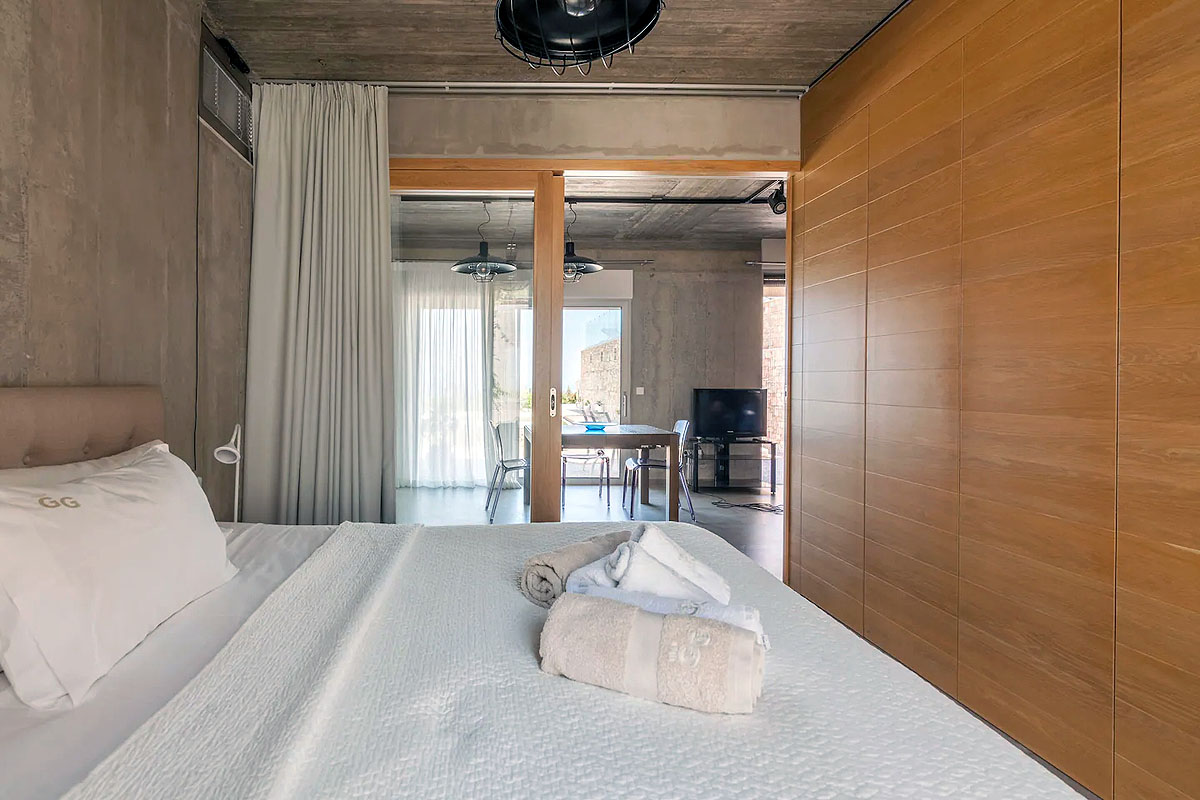 Villa GG has a 350 sqm interior area and is built on two levels. The ground floor consists of an open plan area with large openings that allow the sun in the house, overlooking the pool and garden offering stunning views to the sea. The living room has a fireplace, a sitting with comfortable sofas and a smart TV. Next to the living room is a beautiful fully equipped kitchen with a range of modern appliances where you can prepare breakfast or dinner for your loved ones.