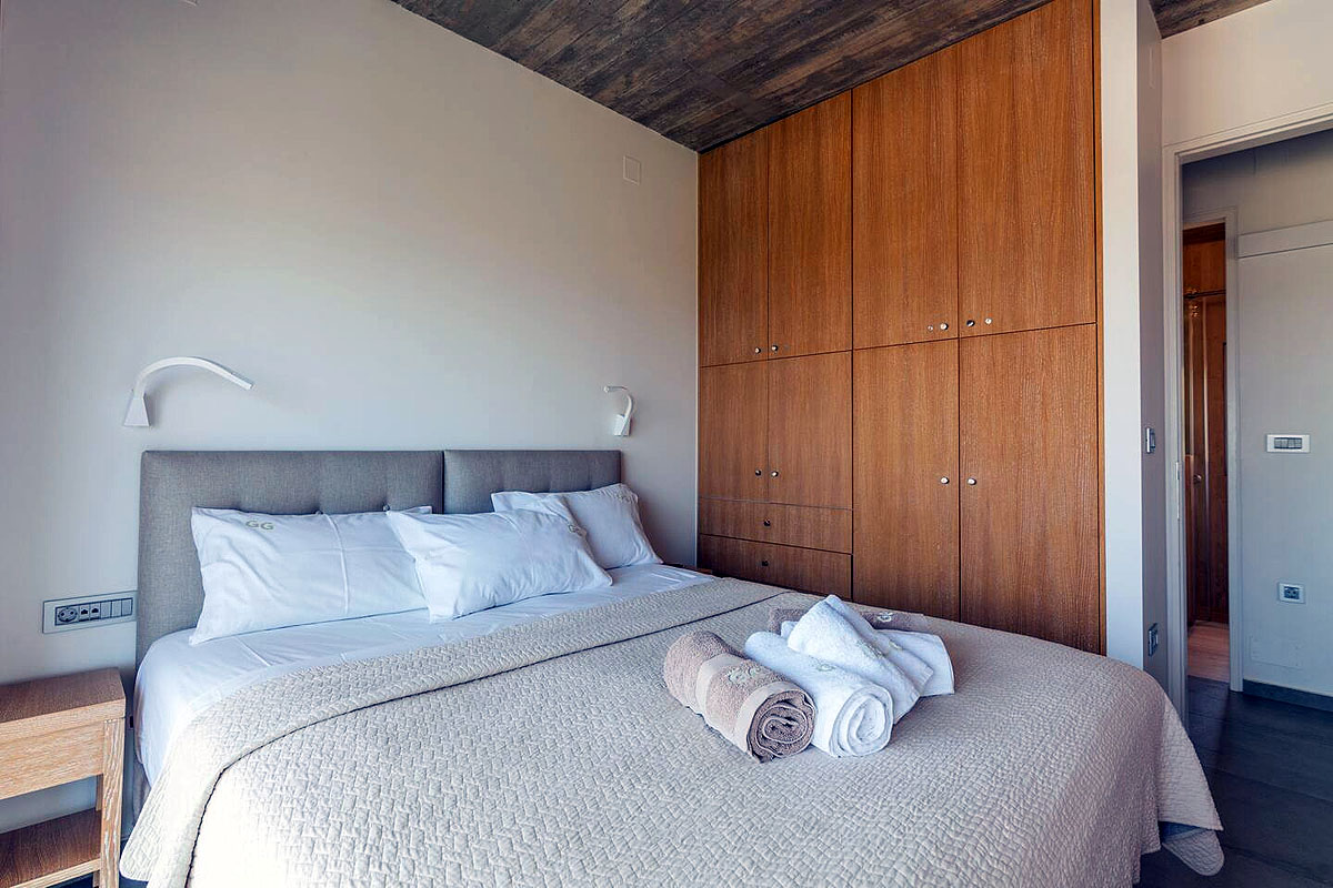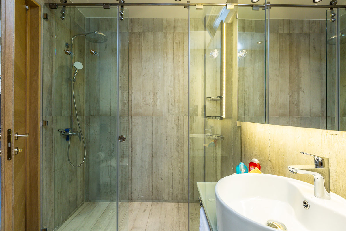 On this level there is also the master bedroom with a double bed and en-suite bathroom with a Jacuzzi bathtub, 2 double bedrooms and a sharing bathroom with a shower. The fourth bedroom with a double bed is located at the lower level and has a bathroom with a shower. An indoor sauna and a fitness room is also available.