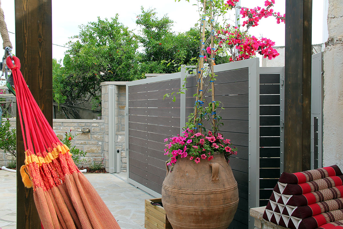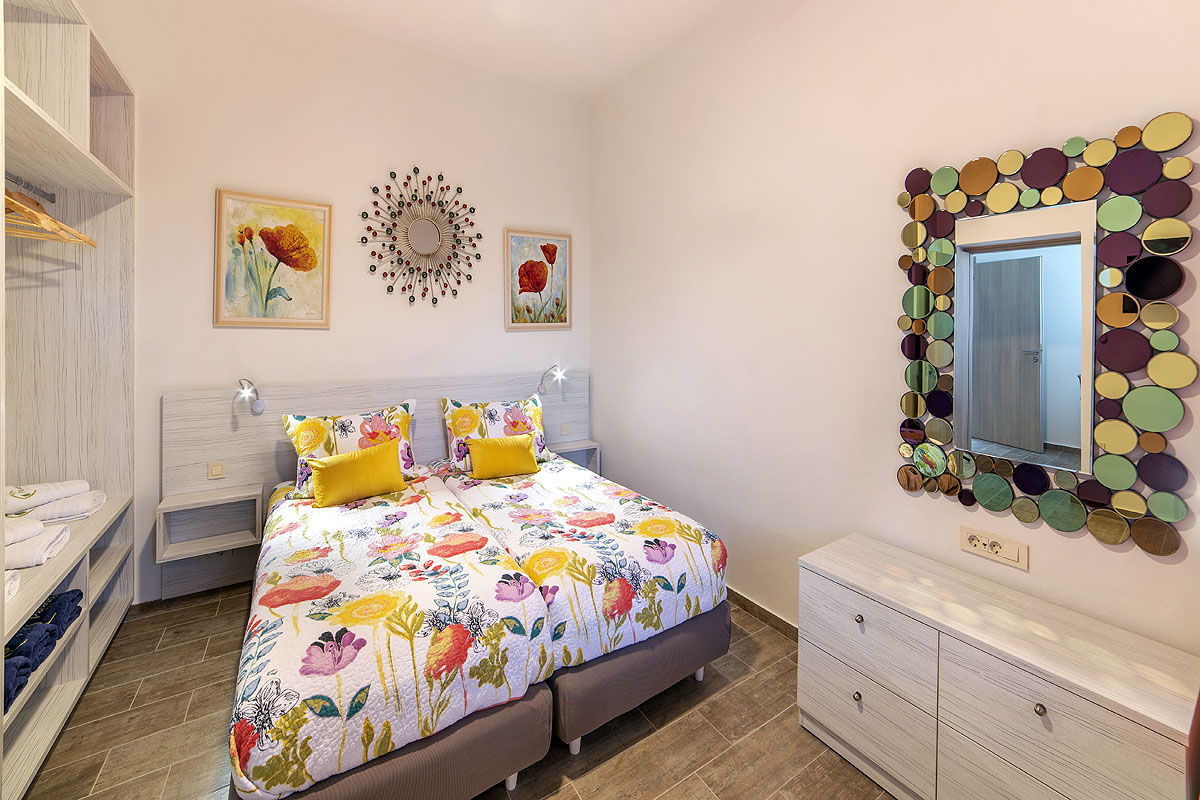 The whole villa is ground level and handicapped accessible and has two master bedrooms. The west-facing master bedroom features an antique-like cast iron bed with Cocomat (the best eco-friendly Greek) top mattress, and has a private bathroom with a Whirlpool tub/shower combination and two sinks. It has a patio door opening onto a private alcove, with marble table, stone benches and barbecue, where you can sit below the thick shadows of a large lemon tree. You will love spending the warm summer hours there, with your favorite novel and a glass of cold lemonade (yes, you can make it yourself by picking lemons from the tree!).