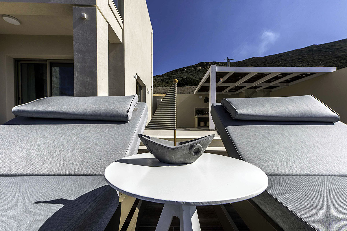 The villa is situated at a very idyllic point and nothing can interrupt the magical views of the Cretan sea and mountains. As the villa is located on a hill, the last 600m to reach the complex is an off-road road. We recommend using an SUV car in order to reach the complex easily.