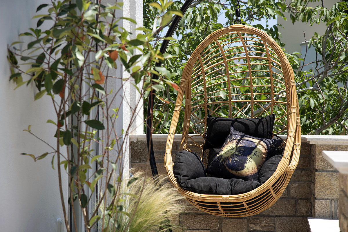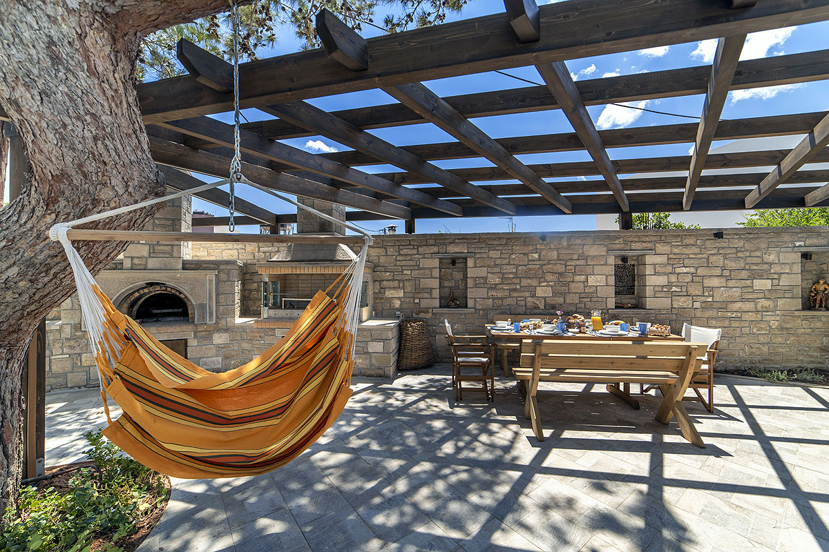 Villa Pefka is a beautiful mezonette (3 floors) inspired by wilderness in colors of red, orange and blues. Located in a fenced, wooded, secluded lot, with mature tall pecan and pine trees, private infinity pool and barbecue. It has 3 private bedrooms with en-suite bathrooms, as well as a loft bedroom with en-suite WC.