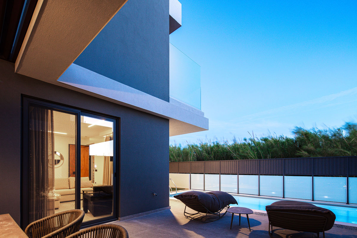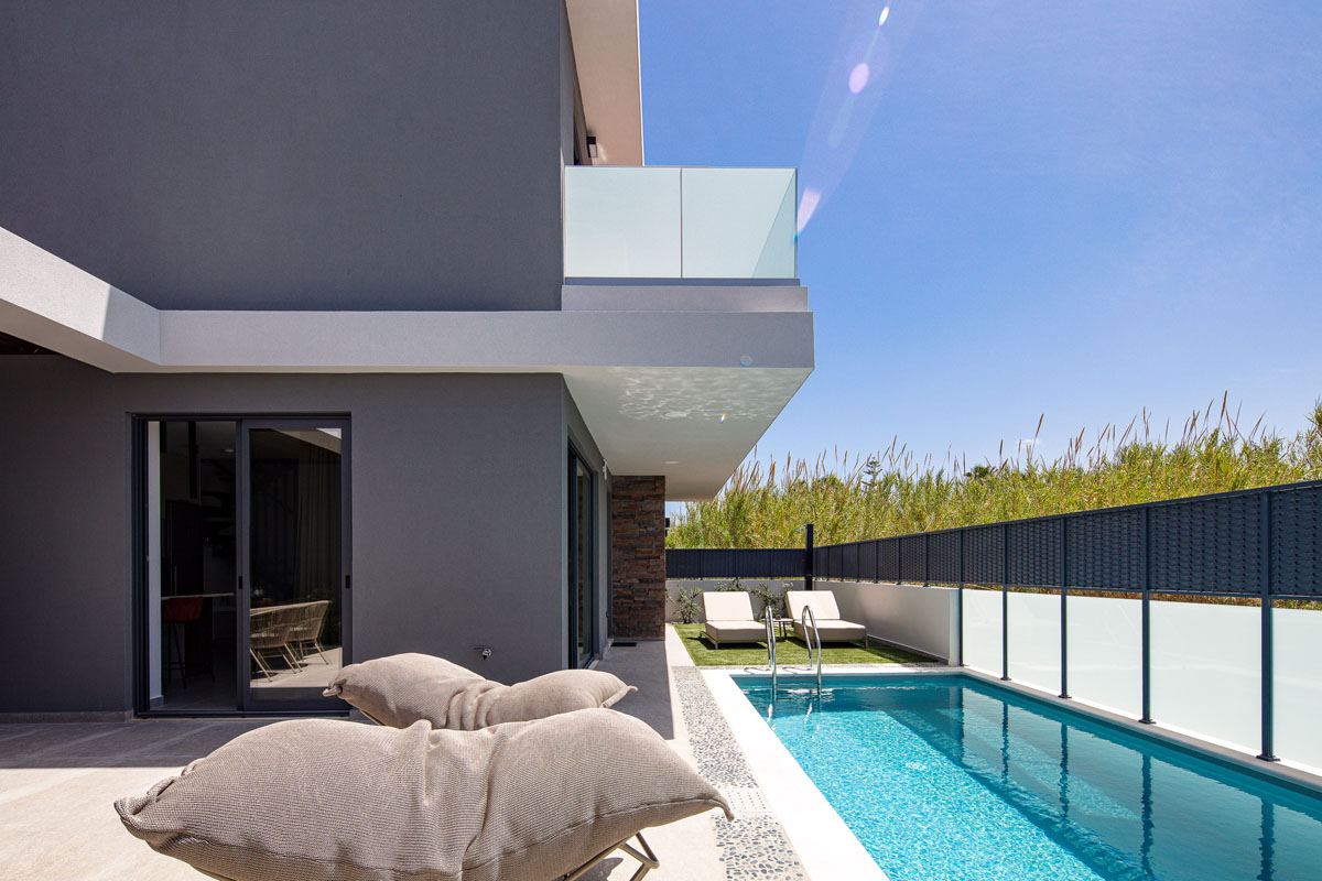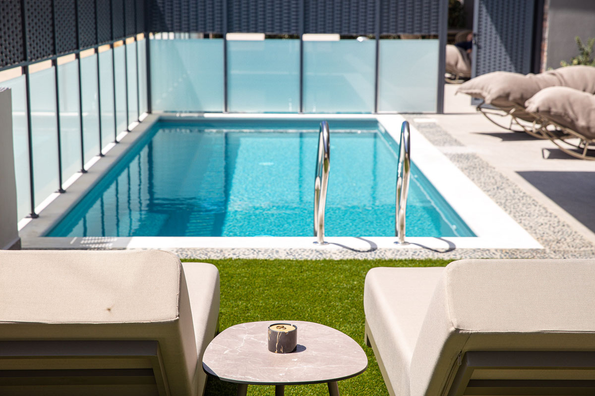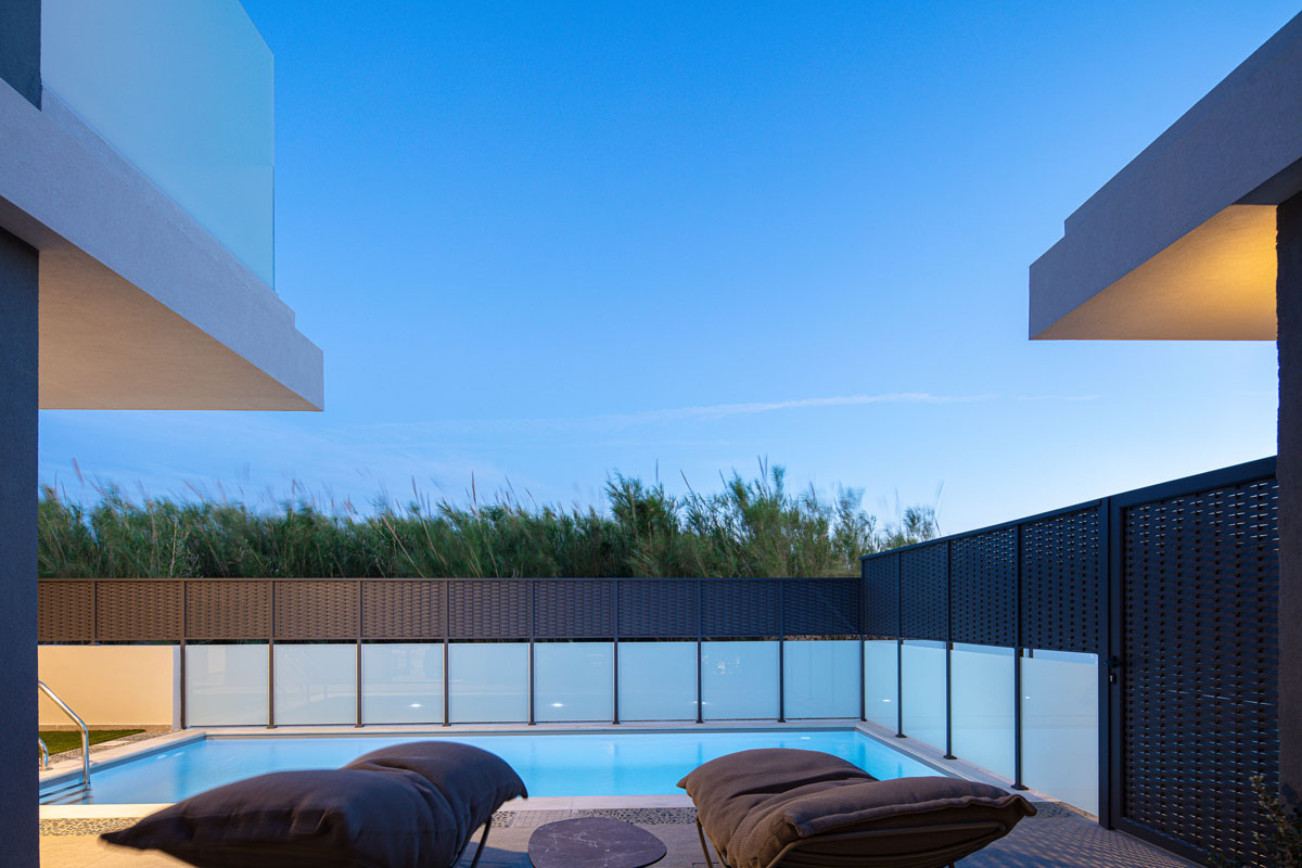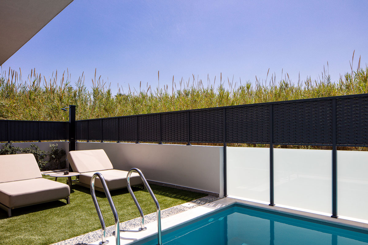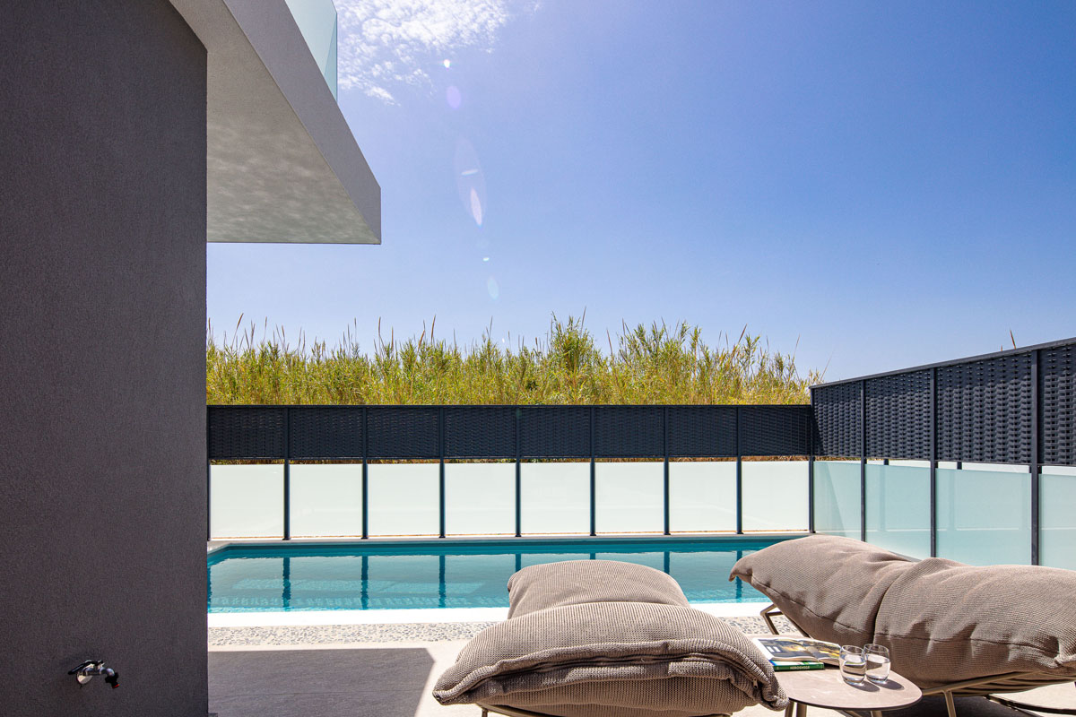20 sqm private pool is surrounded by a sunbathing area with 2 sunbeds, 2 sez long chairs,