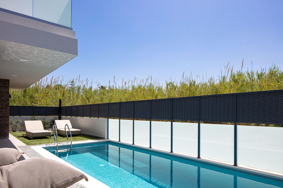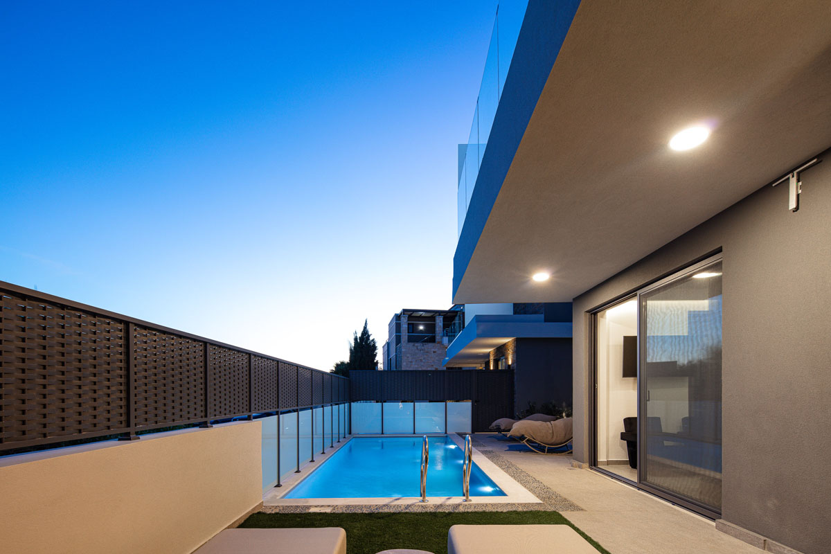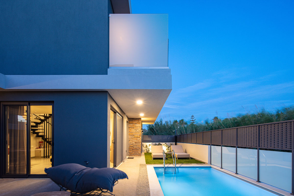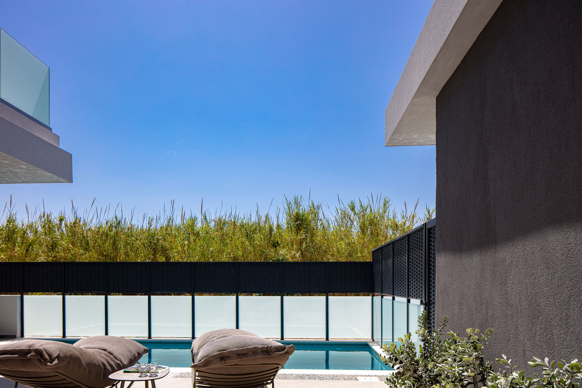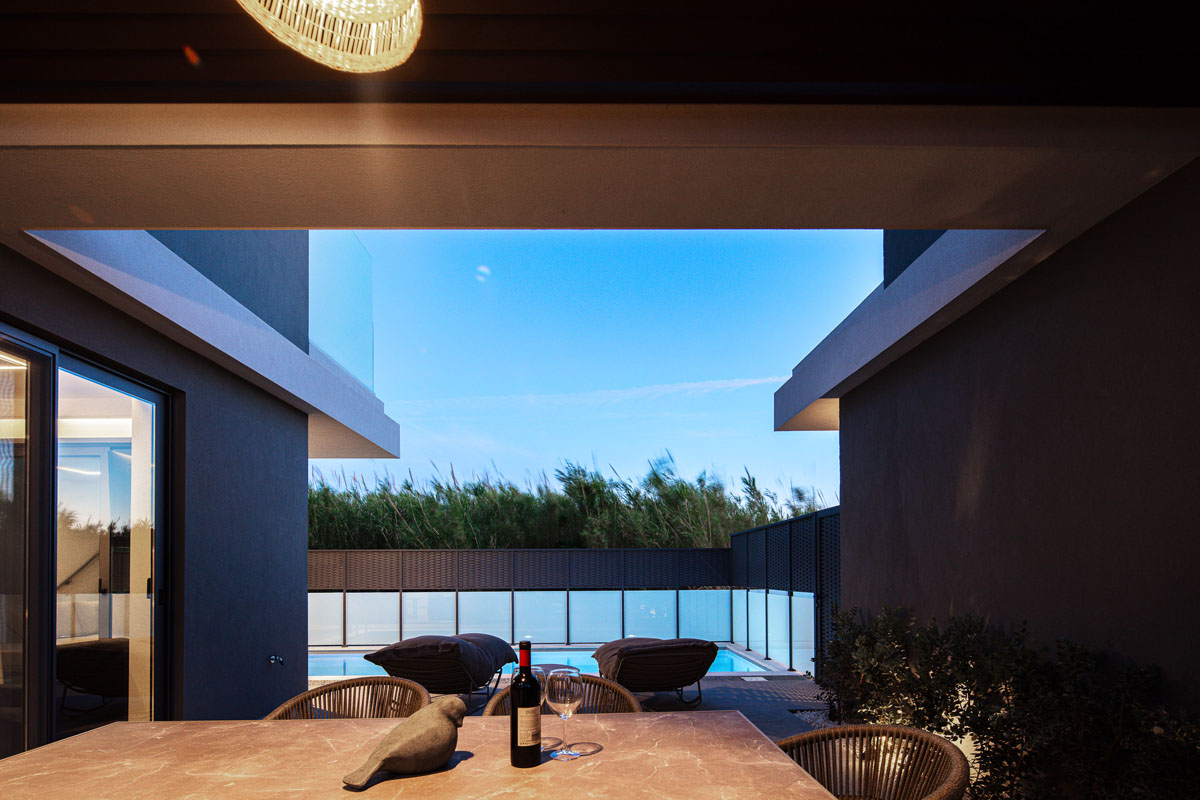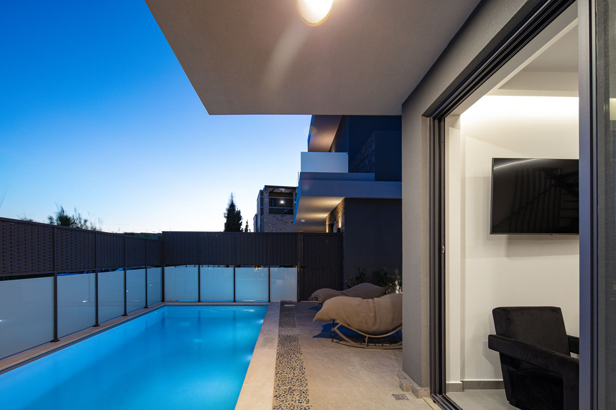 20 sqm private pool is surrounded by a sunbathing area with 2 sunbeds, 2 sez long chairs,